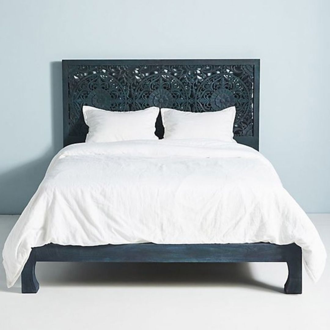 Story: This carved wooden bed frame Skillfully handcrafted by Indian artisans, our Collection’s modern lines and contemporary, minimalist styling are designed to perfectly complement its practical functionality. Wooden and upholstered tabletops are accentuated by parsons-style solid wood table bases, featuring classic natural finishes designed to easily blend with any décor style.