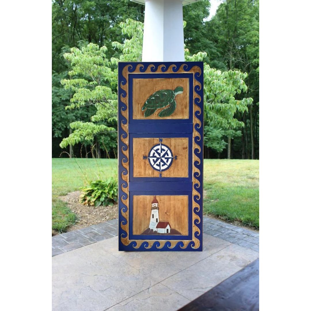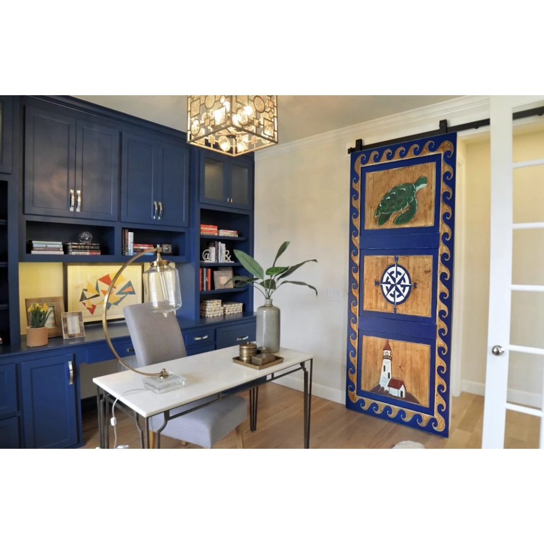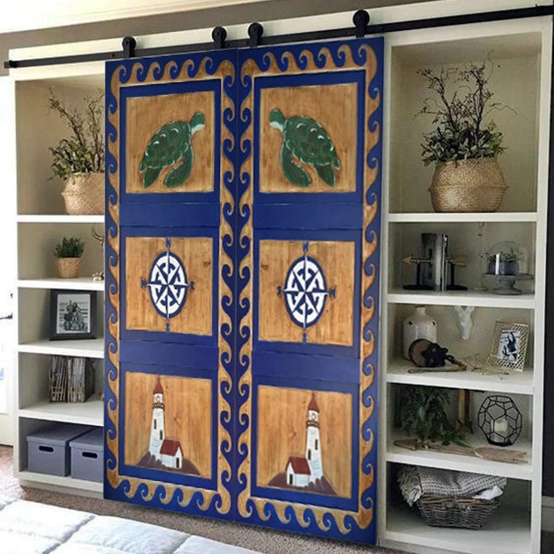 Hand-Carved Nautical Barn Door, Custom Size Exterior Interior Double or Single Sliding Doors, Sea Turtle, Lighthouse, Nautical Compass Decor