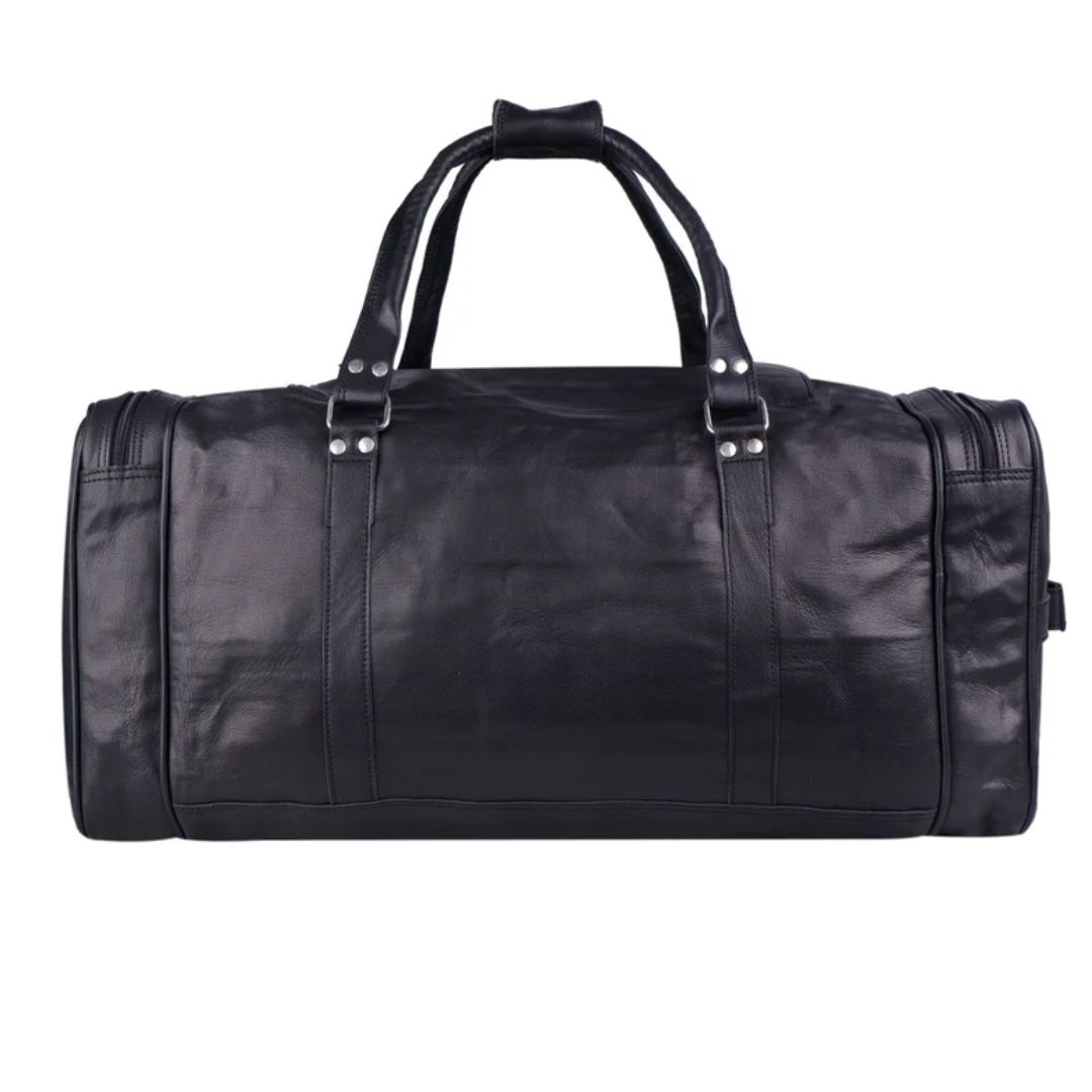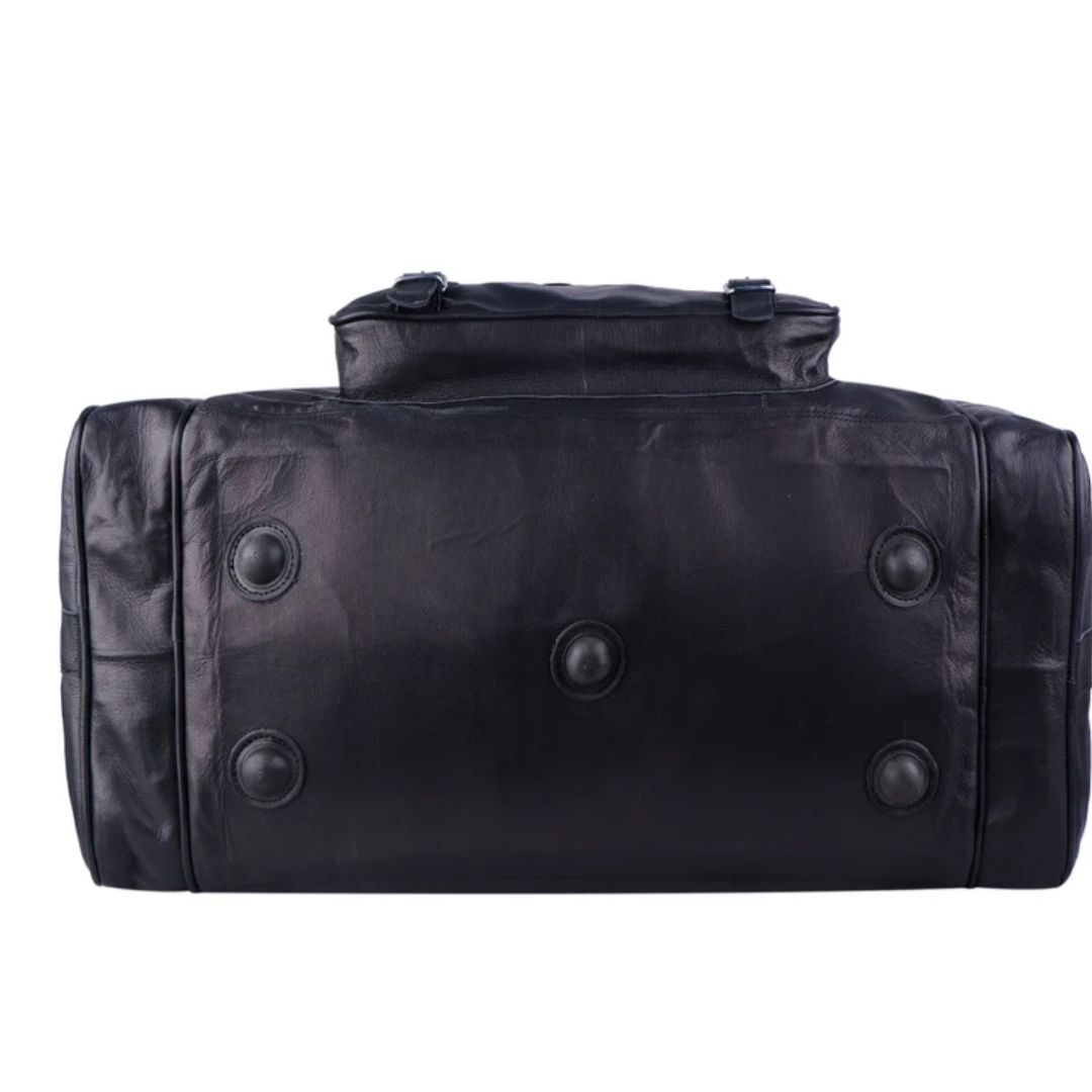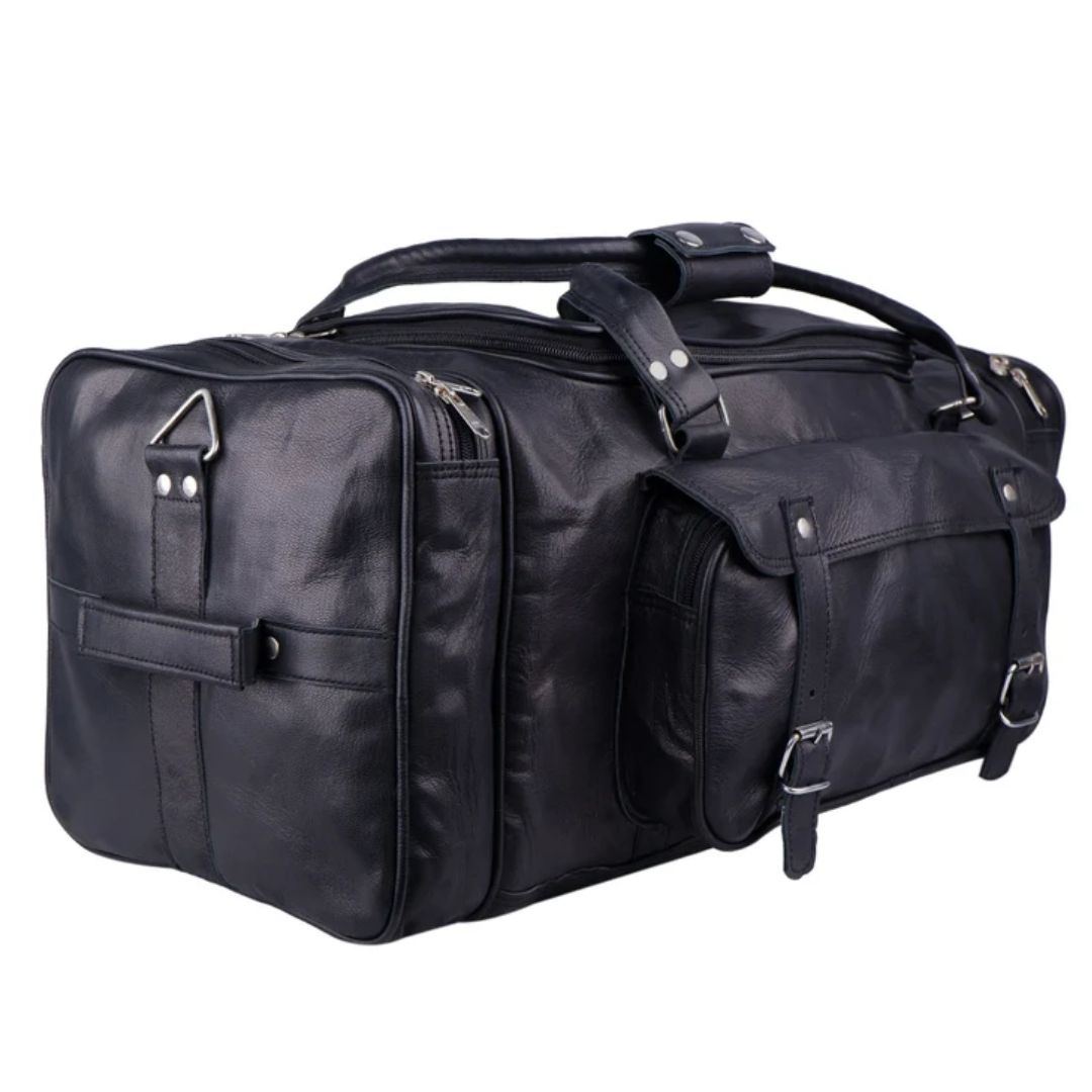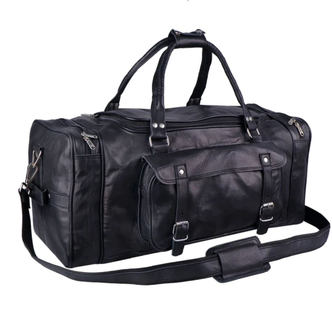 Crafted from the finest quality full-grain leather, this weekender duffel bag is a must-have for your travel trips. The black color with rustic silver color hardware gives it a classy and eye-catchy look. This leather bag is spacious enough with four compartments, one big compartment for all your clothes and shoes, two small side compartments with a zipper for all of your accessories, and one front pocket with buckles. This is a multipurpose bag and can be used as a gym bag, overnight bag, weekender bag, travel bag for small trips, etc.