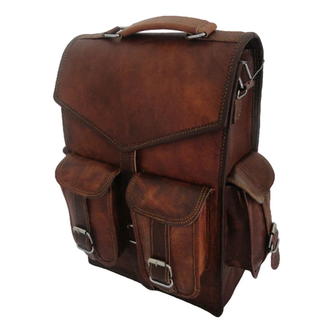 The convertible leather backpack has three major compartments with one specifically dedicated to your laptop. In addition to that, it has two full-size zipper compartments for your laptop accessories, books, iPad, etc. and four buckle-fastened pouches placed around the bag for your daily essentials. It comes with a detachable strap that lets you carry it in three different styles making it the perfect bag for all occasions. Attach it with the rear buckles to wear it on your back for daily use or with the side buckles to wear it as a side bag for a casual look or maybe just carry it from the top leather handle as the professionals do, no straps attached!