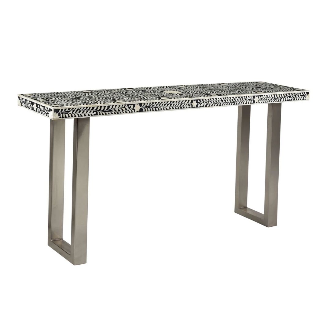 Introduce an element of visual interest to your home decor with this striking Hall Table that features a stunningly detailed and handcrafted bone inlay design that is bound to catch the eye.