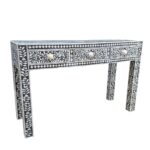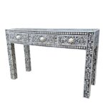 Originally handcrafted for the royal palaces of Rajasthan , the time-honored art of Bone Inlay involves intricate fragments of hand-carved buffalo bones being affixed onto furniture in mosaic-like designs. Our bone inlay collection has been handcrafted from ethically sourced buffalo bones in India, making each piece unique in its disposition.