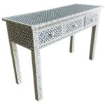 Originally handcrafted for the royal palaces of Rajasthan , the time-honored art of Bone Inlay involves intricate fragments of hand-carved buffalo bones being affixed onto furniture in mosaic-like designs. Our bone inlay collection has been handcrafted from ethically sourced buffalo bones in India, making each piece unique in its disposition.