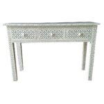 Originally handcrafted for the royal palaces of Rajasthan , the time-honored art of Bone Inlay involves intricate fragments of hand-carved buffalo bones being affixed onto furniture in mosaic-like designs. Our bone inlay collection has been handcrafted from ethically sourced buffalo bones in India, making each piece unique in its disposition.